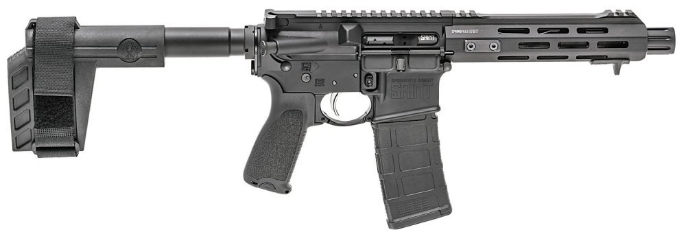 Springfield’s Saint AR Pistol features a forged upper and lowers 7075-T6 aluminum receiver with an Accu-Tite tension system and a receiver end plate with a QD swivel mount point. It also has a 7.5″ 416R stainless steel barrel with Melonite treatment and a SA forward blast diverter. The handguard is free-floating with M-Lok and a forward hand stop. The Saint AR Pistol also features an SB Tactical SBX-K forearm brace, a Bravo Company MOD three pistol grip, carbine “H” heavy tungsten buffer, and a 30-round Magpul PMAG Gen 3.
